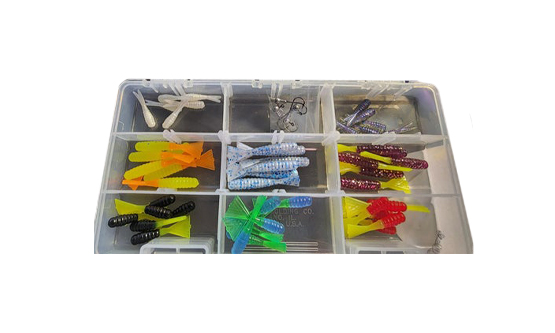 4.5-inch x 9-inch Variety Box Includes: ten 1/32oz jig heads, ten 1/8th oz jig heads, ten 1/16thoz jig heads eight small fry, twenty 2-inch Guppy Gobblers, and twenty 1.5-inch Guppy Gobblers (various colors of our choice), and 20 Small Fry.
